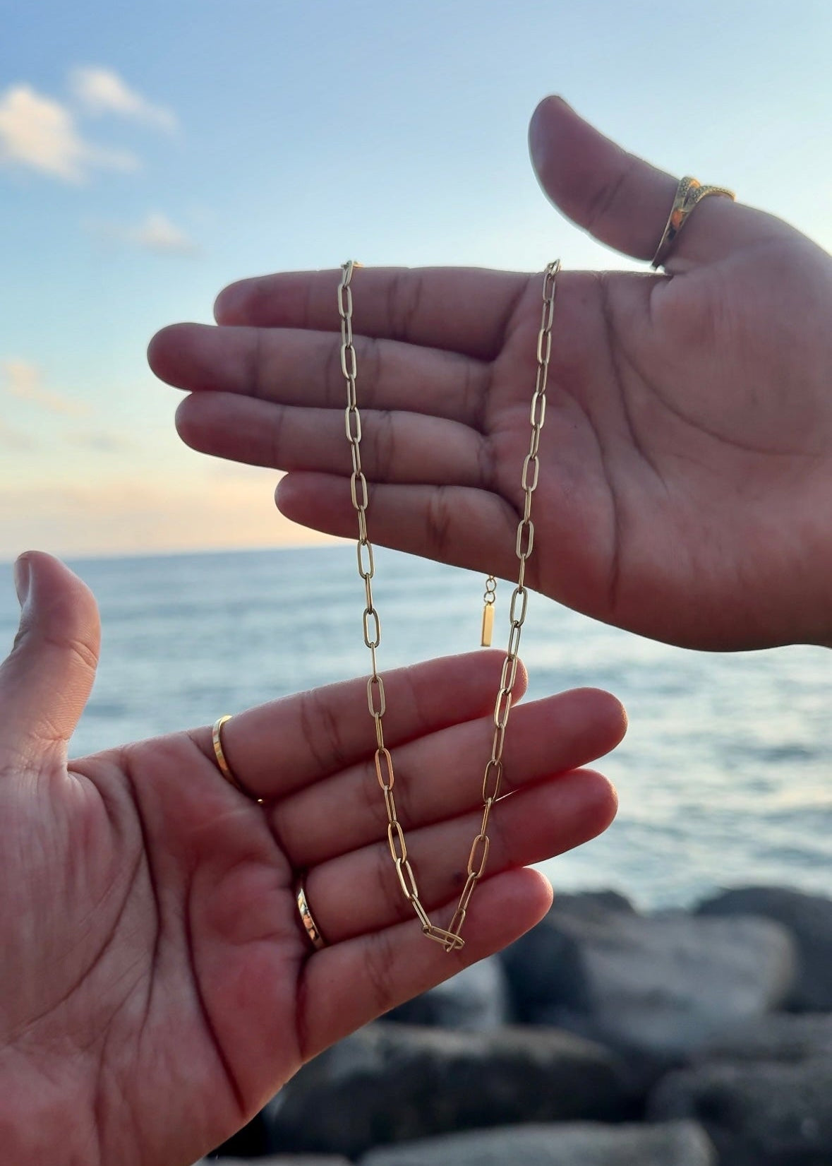 Paper clip design layer. Lightweight, bold, and effortlessly elevated for everyday island wear.